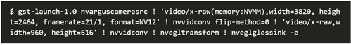 $ gst-launch-1.0 nvarguscamerasrc sensor_id=0 ! 'video/x-raw(memory:NVMM),width=3280, height=2464, framerate=21/1, format=NV12' ! nvvidconv flip-method=2 ! 'video/x-raw, width=816, height=616' ! nvvidconv ! nvegltransform ! nveglglessink -e