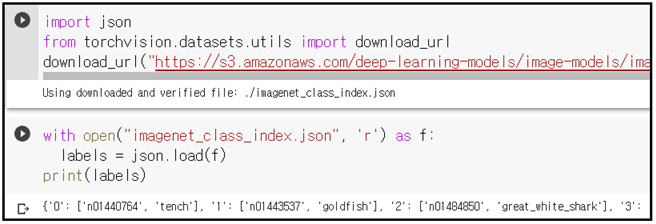 계산이 완료된 샘플 이미지 데이터의 label 값을 텍스트로 출력할 수 있도록 alexnet 의 1000가지 라벨 값 사전에 해당하는 json 파일을 다운받아 출력해보자.