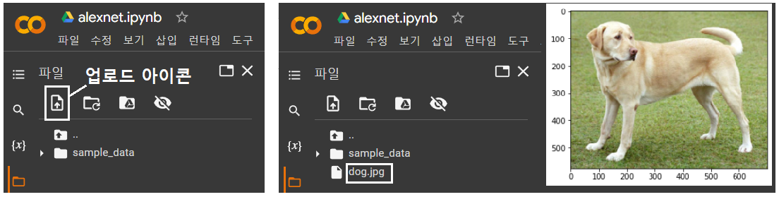 구글 Colaboratory 좌측에 폴더를 클릭하면 화샇표 “↑” 기호가 들어 있는 업로드 아이콘을 볼 수 있다. 이 아이콘을 클릭하여 네 PC의 사용자 폴더 탐색기가 나타나면 미리 저장해 두었던 dog.jpg 그림 파일을 탐색하여 그림 파일을 NDRIVE 상의 sample_data 폴더 바로 밑에 직접 업로드 한 후 읽어서 이미지를 출력하도록 한다.