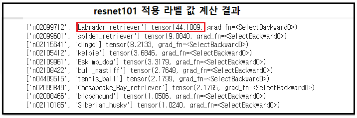 softmax에 의해 확률적으로 계산된 샘플이미지의 라벨 값을 앞서 다운로딩한 json 데이터를 사용하여 인식 확률이 높은 순으로 출력해 보자. Labrador _retriever 라는 종의 개가 가장 큰 인식 확률 54.7129를 보여준다.