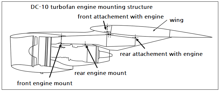 The following figure is a side view showing how to attach a turbofan engine of a DC-10 civilian jet aircraft from McDonnell Douglas, now Boeing, to the wing. The structure must be strong enough to withstand a fairly heavy engine load on the wing structure at two points, forward and rearward, to be connected to the engine housing. What is the name of the part that can suspend and support this engine structure and be connected to the wing? In the case of fighters, fuel tanks to increase the range or weapons are sometimes attached instead of engines, and these are also called hard points.