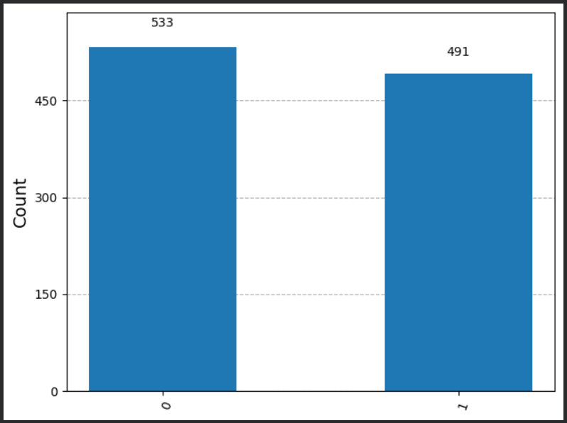 결과를 보면 1024회 양자회로 실행 중 "0"(|0>) dl 533회, "1"(|1>)이 491회로 큐비트 초기값이 "0" 이나 "1" 이 될 확률이 근사적으로 50% 임을 알 수 있다.