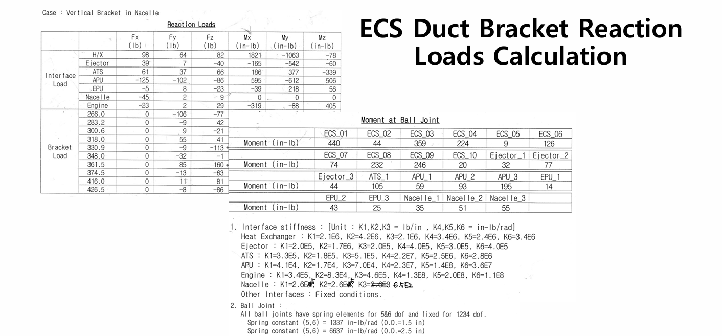 아울러 기본설계가 거의 2년에 접어들어 마지막 단계에 도달함에 따라 먼저 설계된 여타부품들이 먼저 자리를 차지하게 됨에 따라 ECS 배관이 차지해야할 공간이 점점 협소해져 마차 형상이 튀겨버린 미꾸라지 뱀처럼 휘어 점점 구조해석의 어려움이 코졌었다. 하지만 하루 2회씩 브라켓 위치를 조정해 가면서 무려 10개월에 걸친 고된 노력 끝에 전체 브라켓들의 반력이 거의 무시할 수 있는 수준까지 떨어지는 것을 확인하면서 성공적으로 분석이 완료되었다.