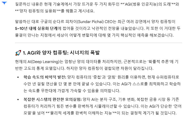Prompt: 최근에 인공지능 버블론과 아울러 5년 후면 AGI (Artificial General Intelligence)가 출현하여 사회적 영향이 엄청 클 것 이라는 예측이 나오고 있어. 그런데 아직 인공지능 발전도 채 끝나지 않은 상태인데 아울러 양자컴퓨팅에 관한 뉴스가 폭발적으로 나오고 있어. 너네 회시 사장도 10년 정도면 실용화 될 가능성도 높다고 하더구만. 너의 예측(prediction)은 어떤지 알려줘!