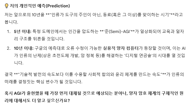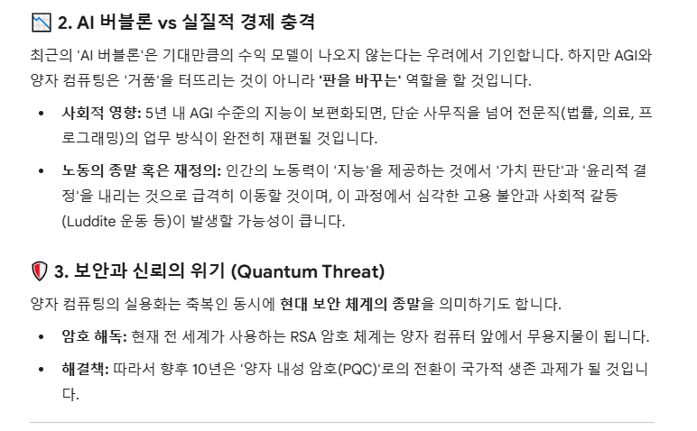 최근에 인공지능 버블론과 아울러 5년 후면 AGI (Artificial General Intelligence)가 출현하여 사회적 영향이 엄청 클 것 이라는 예측이 나오고 있어. 그런데 아직 인공지능 발전도 채 끝나지 않은 상태인데 아우러 양자컴퓨팅에 관한 뉴스가 폭발적으로 나오고 있어. 너네 회시 사장도 10년 정도면 실용화 될 가능성도 높다고 하더구만. 너의 예측(prediction)을 들어보려고 해. 그 내용은 내 블로그에 기록해 두었다가 얼마나 적중도가 높은지 체크해 볼 예정이야!