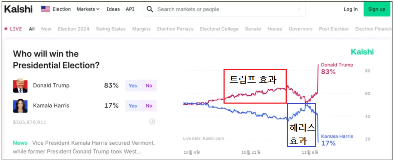 아래 그림은 2024년 겨울 미 대선 당시 poly market 베팅 그래프야!