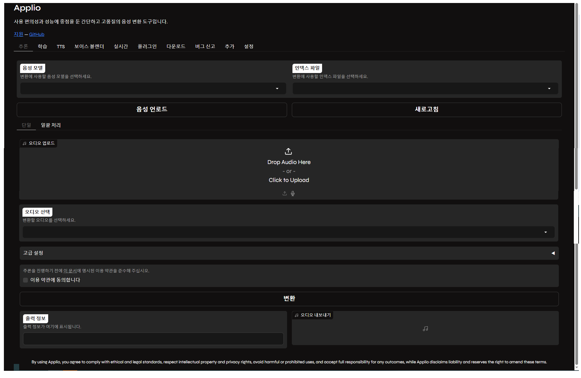 - Applio의 제어 화면이 나타난다면 성공적으로 실행된 것입니다.