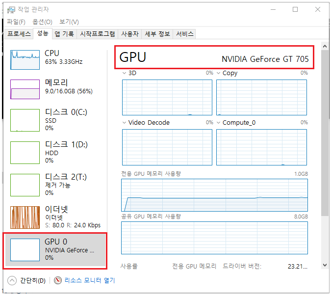 10년 이상 오래된 PC 라서 가속용 GPU 가 있을리 만무하지만 그래도 그래픽 카드는 꼽아두었기에 작업관리자에서 확인해보자. GPU0 를 확인하니 NVIDIA GeForce GT 705 모델이었다. 어쨋든 업그레이드 정도는 해봐야겠다.
