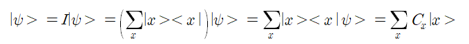 어떤 양자 상태 ∣ψ⟩가 있을 때, 그 앞에 I 를 곱해도 값은 변하지 않는다 (I∣ψ⟩=∣ψ⟩). 여기에 앞서 유도한 수식을 대입해 사용해 보자.