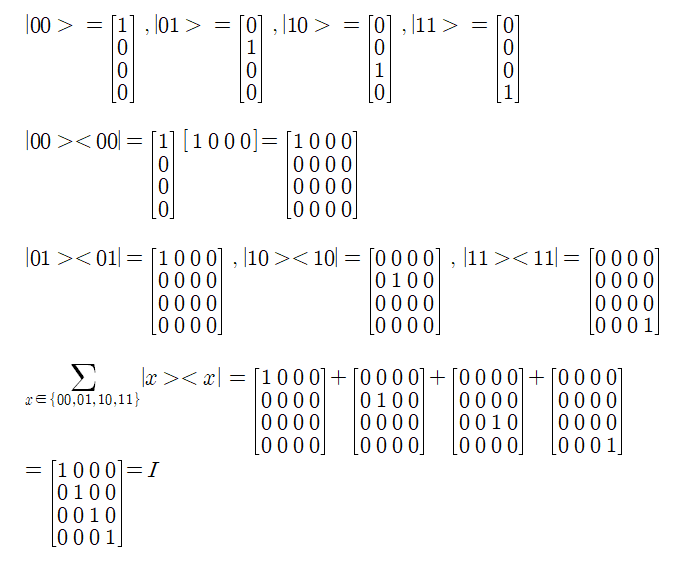 단일 큐비트나 2 큐비트 시스템에서 외적(Outer Product) 연산은 매트릭스 대각선 요소가 1 인 I(Identity) 행렬이 된다. 이 Identity 매트릭스를 사용하여 임의의 양자 상태 프사이(ψ)를 연산 기저에 의한 성분들의 합으로 분해해 보자.