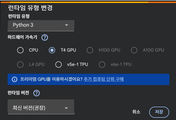 Applio 를 윈도즈나 리눅스 시스템에서 직접 실행을 통해 학습을 할 수도 있으나 연산 시간이 어마어마하게 요구된다. 설사 게임용 그래픽 카드가 설치되어 있어도 요구되는 연산 시간 부담이 엄청나다. 따라서 그 대안으로 구글 NDRIVE 의 무료 엔비디아 GPU T-4 서비스를 사용하도록하자. 런타임 탭을 눌러서 다음과 같이 T-4 GPU를 선택하여 저장하자.