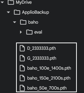 학습 완료 전에 ApplioBackup 하위의 프로젝트명 baho 폴더에서 중간 pth 파일들 출력 결과를 점검해 볼 수 있다.