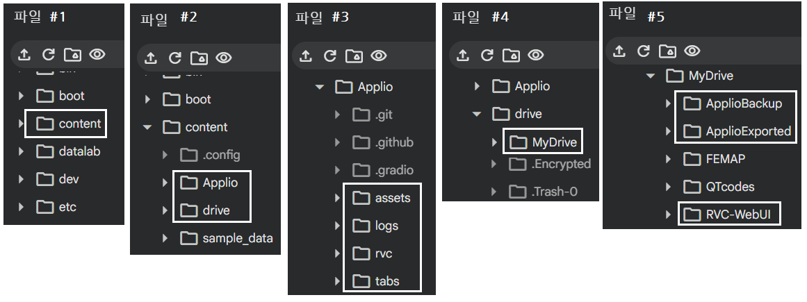 Applio 가 실행되면 #2 구글마운팅에 의해 #2에서 처럼 MyDrive 를 포함하는 drive 폴더가 생성되어 있으며 아울러 Applio 폴더가 생성된다. 클라우드 사용법인 구글 마운팅은 정해진 방식대로 /content/drive/MyDrive/ 로 경로가 형성되고 MyDrive 내부에 사용자가 구성한 폴더들이 위치하게 되어 필요시 파일들을 불러올 수 있게 된다.