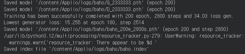 마지막 출력 결과를 요약하자. Applio/logs/baho 폴더에 G_...pth, D_...pth, baho_200e_2800s.pth alc baho.index 학습 데이터 파일들이 생성되었으며, 이들은 추론(inference) 단계에서 사용된다.