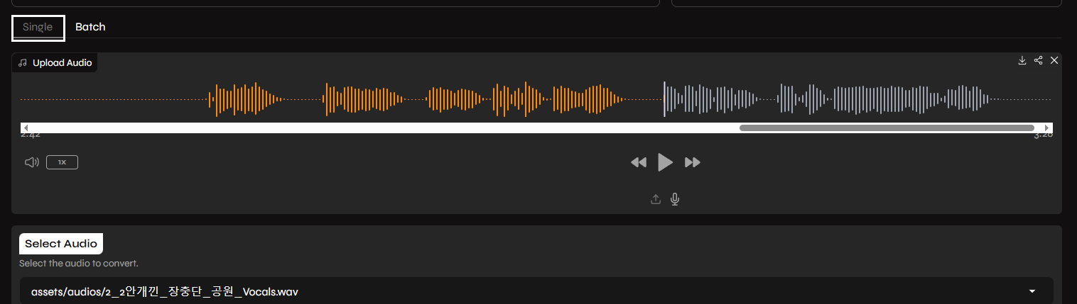 일단 합번 AI VoiceCover 작업을 실시하면 다음과 같이 업로드한 파형이 남아 있게 된다. 앞 선 작업을 지우고 새로 타겟 노래 목소리를 업로드 하기 위해서는 우측 상단의 x 버튼을 클릭하여 지우자.