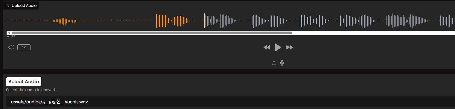 완료되면 다음과 같이 음성의 진폭 파형을 볼 수 있으며, 이는 Applio/assets/audios/5-5 당신_Vocals.wav 로 저장됨을 확인할 수 있다. 준비가 다되었으므로 마지막 Convert 버튼을 누르자.