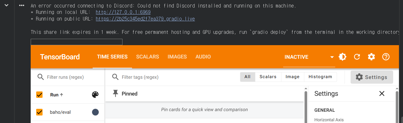 Applio.ipynb 를 모두 실행하게 되면 5분 정도 걸리는데 구글 마운팅 작업 후 끝 부분에 2개의 URL주소가 나타나고 Inactive 하다는 출력과 함께 텐서보드 그래픽이 나타난다. Gemini에게 문의한 바에 의하면 이 부분에서 Error 라고 생각하면 안된다.