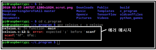 각 줄을 코딩 한 후 명령 별로 줄 구분을 위해 반드시 세미 콜론(;) 기호를 입력해야 한다. 하지만 인위적인 연습을 위해서 문법 에러를 유발할 수 있도록 printf(⚫⚫⚫temperature: “)) 명령 다음의 세미 콜론을 빼 보기로 한다.