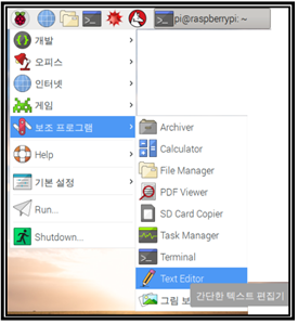 윈도우즈에서의 명령 창에 해당하는 라즈베리 파이 터미널 창에서 nano 편집기를 사용하여 직접 C 프로그램을 편집하는 것은 대단히 비효율적이다. 라즈베리 파이에서도 Jesie 또는 Stretch 버전의 보조 프로그램에 Text Editor 가 있어 편리하게 C 코드를 편집할 수 있다.