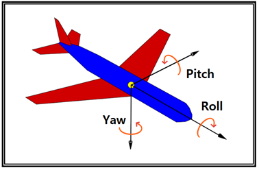 MPU6050 센서 사용법을 알아보자. MEMS 칩을 포함하고 있는 MPU 센서를 간단히 요약하자면 6자유도에 해당하는 모션 센싱이 가능하다. 아래의 항공기 schemetic에서 전진 축 방향을 기준으로 항공기 기체가 좌우로 각속도 값을 가지고 회전하게 되면 ROLL 모션이 된다. 만약 항공기 기체가 상승을 위해 들어 올려지거나 내려지면 Pitch 모션이 되며 수직 높이 축을 중심축으로 하여 항공기가 평면상에서 좌우로 회전하게 되면 Yaw 가 된다.