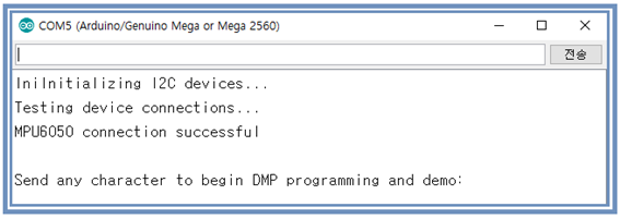 다시 시리얼 모니터를 켜고 initializing... 과정을 확인 후 박스에 문자를 입력 전송하여 ypr 데이터 출력을 확인한다. 확인이 끝나면 시리얼 모니터를 반드시 꺼야(OFF) 한다. Processing 코드 또한 시리얼 USB 케이블을 통해 PC 에 입력되는 COM 포트를 인터페이스 하게 되는데 만약 아두이노의 시리얼 모니터가 연결되어 있다면 “Port is busy” 라는 에러가 출력될 수밖에 없다. 즉 PC의 Processing 코드와 USB 케이블로 연결된 아두이노를 인터페이스하여 사용할 경우 반드시 1개의 시리얼 인터페이스 사용이 허용되기 때문이다.