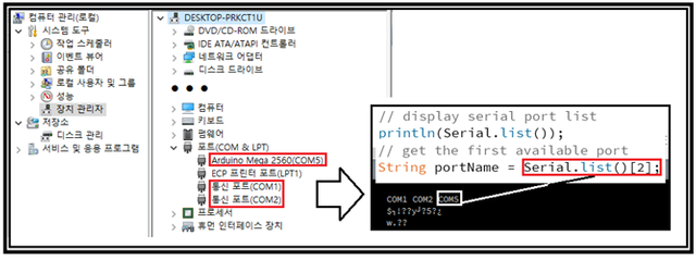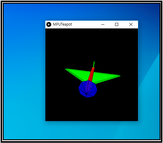 MPUTeapot을 실행시키기 전에 시리얼 인터페이스 코딩 부분을 확인하도록 한다. 윈도우즈10의 컴퓨터 관리-장치 관리자-포트를 살펴 보면 COM1, COM2, COM5가 Processing Console 창에서 인식이 된다. 아두이노는 물론 COM5 에 물려 있다. 따라서 애초에 Teapot을 열면 Serial.list()[0]으로 코딩되어 있으므로 3번째에 해당하는 Serial.list()[2] 로 수정해야 한다. 실행하게 되면 컬러 모형 비행기가 자세 잡는 동영상을 볼 수 있다.
