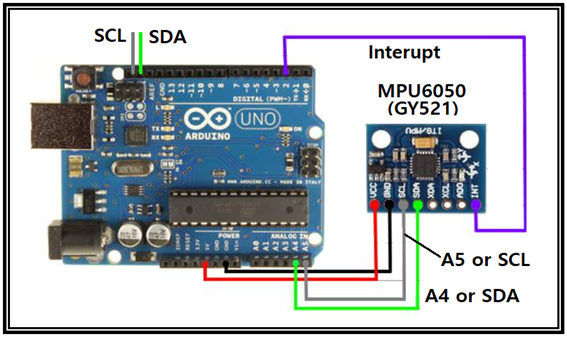MPU6050은 6개의 순간 값을 센싱하여 DMP(Digital Motion Processor) 로 처리하여 인터럽트 신호와 함께 아두이노 보드에 I2C 인터페이스를 통해 전송한다. I2c 배선은 SDA,SCL 에 A4,A5핀 또는 반대편 아두이노 USB 가까운 쪽에 위치한 SDA,SCL 에 직접 배선해도 된다.