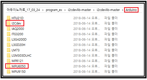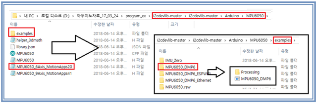 한편 아래의 디렉토리 구조를 참고하여 MPU6050_DMP6 아두이노 코드를 불러내고 앞에서 언급한 라이브러리 2개를 설치한다.